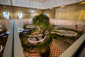 In dit ruimtelijke kantoor is plek voor grote, opvallende armaturen. Dus we mochten uitpakken en zijn aan het assembleren en monteren geslagen in onze eigen werkplaats. Meten, lassen en schroeven. Iedere dag ontwikkelen tien technische collega’s armaturen die geen ander kantoor heeft.
